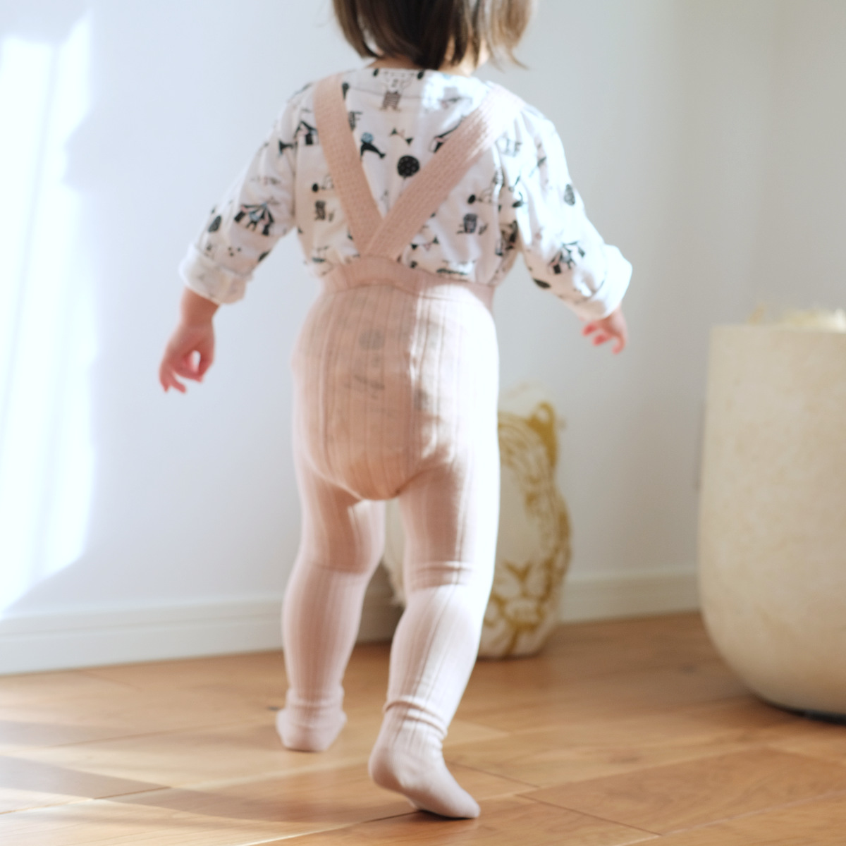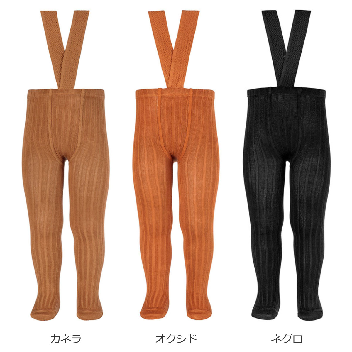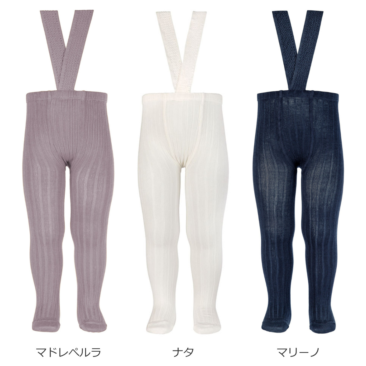 サスペンダーが付いたリブタイツです。サスペンダーは、ウエスト部分にしっかり固定されているので、あちこち沢山動きまわっても脱げる心配はありません。
